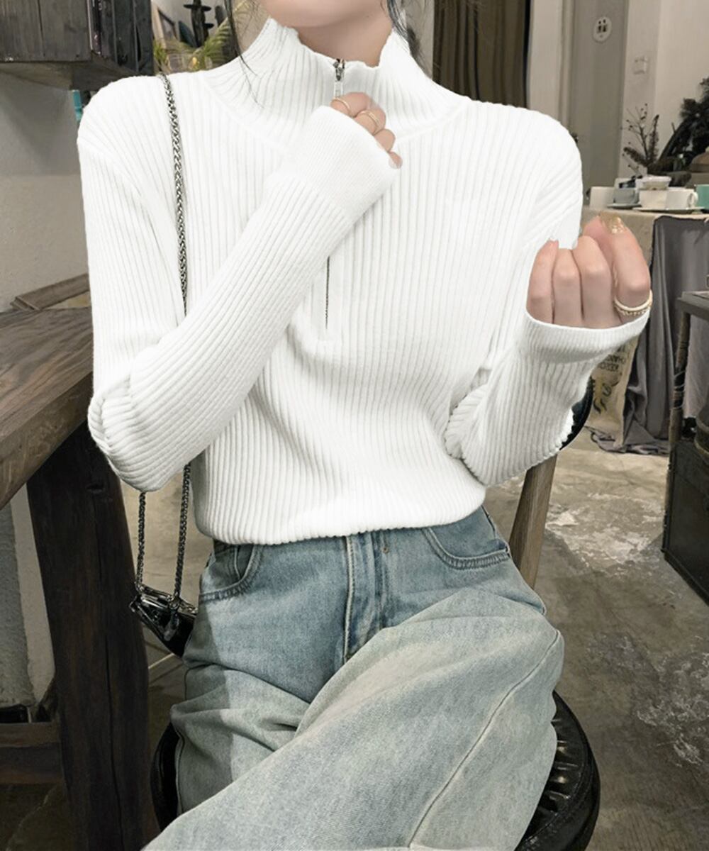 レディーストップス ハイネック 長袖 ZIPニットセーター お洒落 ニットウェア 通勤通学 リブニット 韓国ファッション