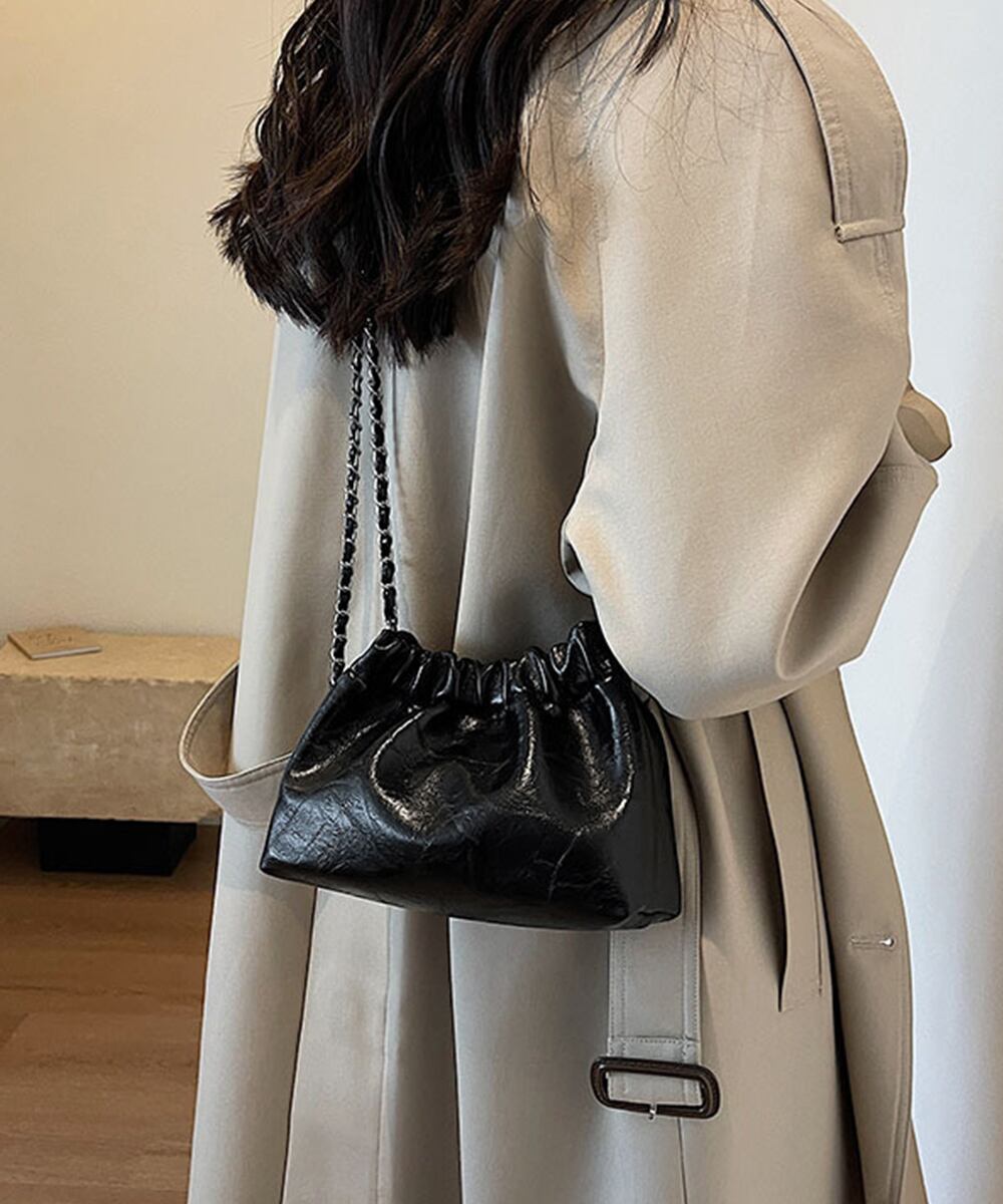 上品な光沢感とエレガントなデザインが魅力のモダンな巾着型ショルダーバッグ。