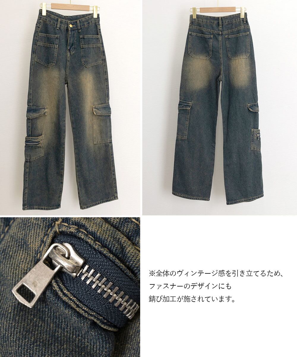 デニム素材とカーゴデザインを融合させた、ユニークなレディースストリート系ロングジーンズ
